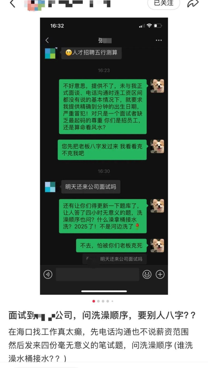 网友求职笔试题目 7月9日,大河报《看见》记者以求职者身份应聘该公司“总经理秘书”一岗向人事部了解招聘要求。除了要满足具备写作、商务接待能力及会开车等要求外,该公司HR向记者表示“初审还需提交五行测算”,并称“我们不搞九型人格测试,我们有专门的老师来进行五行测算,测算一下你的性格适不适合做这个岗位”。 当记者问及是否必须提供时,对方表示人事部门必须准备好以上资料后,才能向相关部门推荐简历。 当天下午,《看见》记者将该情况反映给海口市龙华区人力资源社会保障局,一名工作人员对此表示“无法干涉企业招聘的要求,如果觉得企业有违法情况,建议选择直接报警”。
